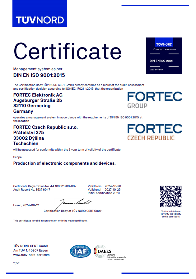 Společnost FORTEC Czech Republic s.r.o. byla certifikována společností TÜV Nord podle normy řízení kvality ISO 9001:2015.